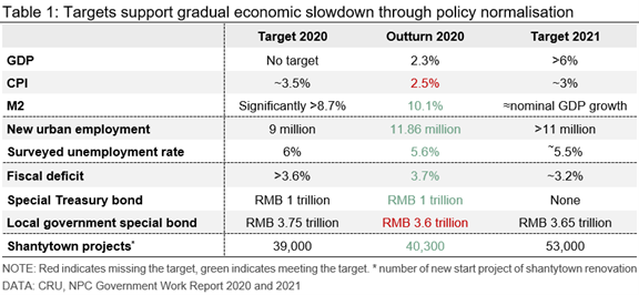 The major macro announcements from the Government National People Congress (NPC) reaffirmed our view that China is keen to withdraw policy support gradually and deliver a gradual economic slowdown over the next five years. By sustainable we mean from an environmental and financial stability perspective. The headline macro targets for 2021 can be seen in the final column of Table 1.
