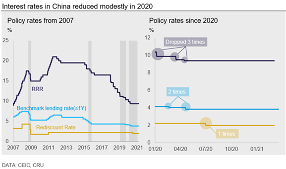 No surprise on the pace of monetary policy normalization: China has several monetary policy instruments that it uses to support credit to the economy. The charts below show that while different policy rates have been eased in China during 2020, the reduction has been small (30 basis points) compared to say the U.S. Fed funds rate (150 basis points) A. Instead, China has moved the dial on monetary easing by increasing the quantity of credit it provides to companies and households. In 2020 it did so by setting a growth target for lending by large commercial banks to micro and small businesses at 40%. The target for 2021 has been lowered to 30%. We expect this to gradually reduce the credit provision and slow down the rate of increase in corporate debt.