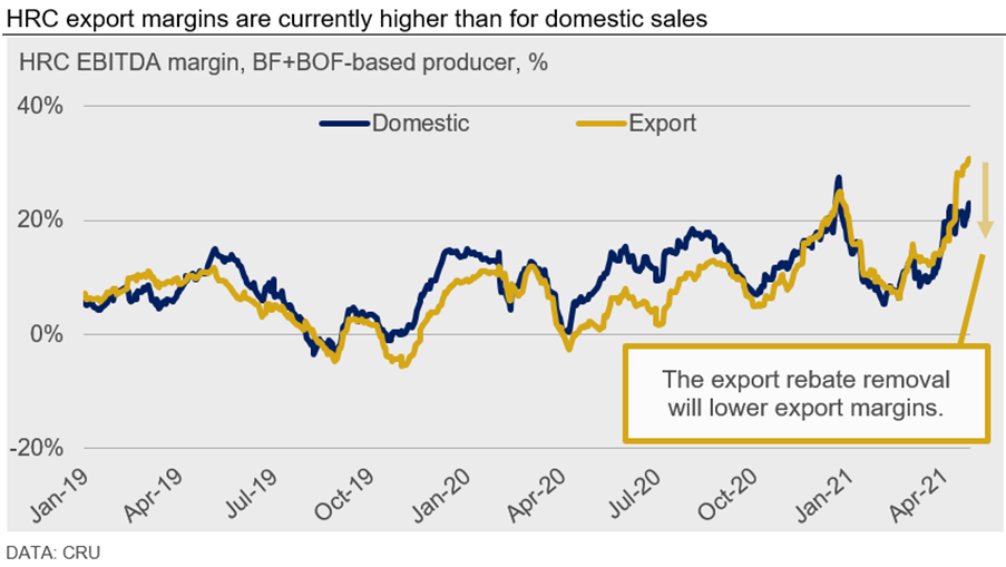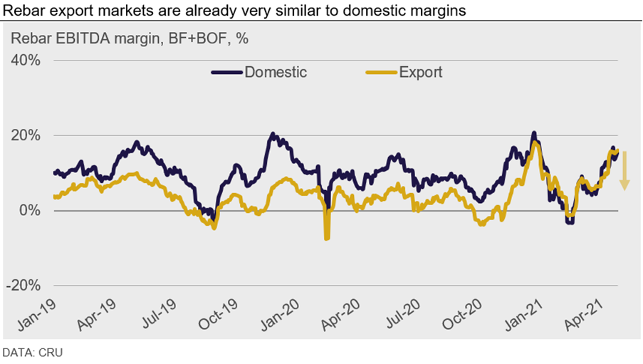 In contrast to HR coil, rebar export margins are already very similar to domestic margins before the VAT rebate cancellation, which means that export margins will fall under domestic margins after its removal. This indicates that the incentive to export will be much less for rebar compared to HR coil.
