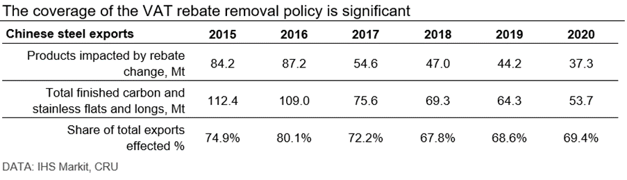 China has announced that it will remove the value-added tax (VAT) rebate it has historically applied to steel exports, alongside changes in import and export tariffs. This will increase the cost of exporting and discourage export volumes, which will help loosen a tight domestic market. Initially, due to the height of flat products prices elsewhere in the world, the greatest impact on trade volumes will be for carbon steel long products.