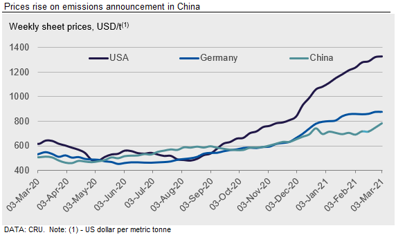 Chinese sheet prices reached a new high this week after a government policy notice on March 2 notifying of emissions production cuts in Tangshan province in late-February to late-March. We expect the impact of this announcement to be lower than the initial price rise suggests. In other regions, sheet prices globally have continued to rise, but at a slower pace.