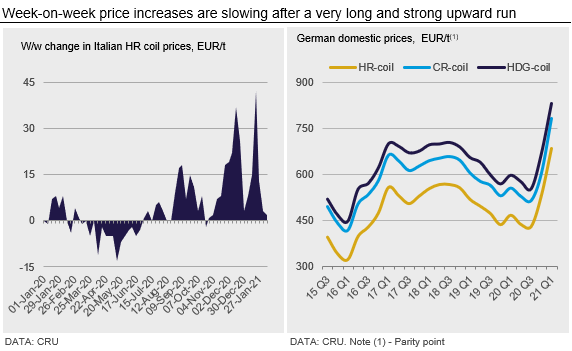 Overall, our 2nd Wednesday price in February is much higher m/m for all sheet products across Europe. This continues what is now an unusually long upward run. It is now 16 weeks since European HR coil prices last fell w/w, which is comparable to the run seen in early 2016. Moreover, that last w/w fall was a single-week event during October, before which there had been another 16-week period of constant increases. Prices are now at least €300 /t higher than their low point of late-June, which is a total increase of 62-88% in that time, depending on product.