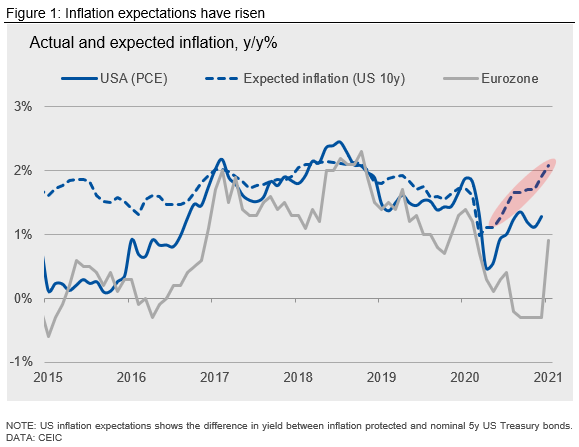 Inflation in many major economies decelerated sharply during the COVID-19 crisis. Inflation has begun to recover in the U.S. and Europe (Figure 1). It is likely to increase further in the short-term as base effects from energy price movements unwind.