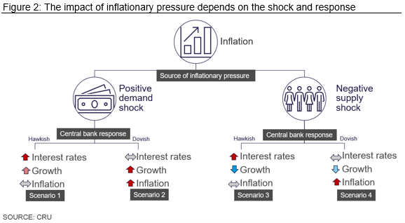 • The underlying cause of inflationary pressure. A rise in inflation could come from either stronger demand (e.g. fiscal stimulus) or weaker supply (e.g. a shrinking pool of workers).
