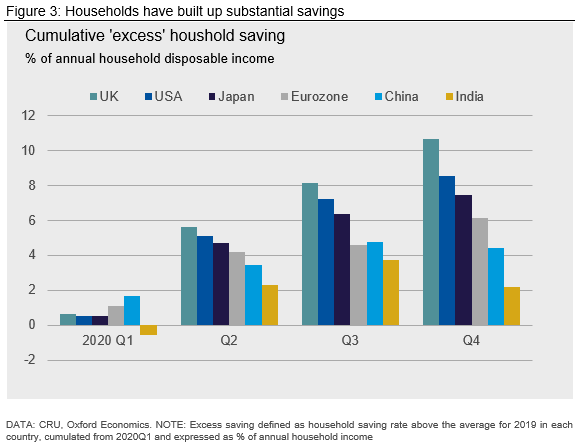 Lockdowns and social distancing have resulted in “forced saving.” Households still in work (or whose income is fixed or protected by fiscal support) have been unable to spend on hospitality, leisure and other services. This has led to households—in aggregate—increasing their savings substantially.