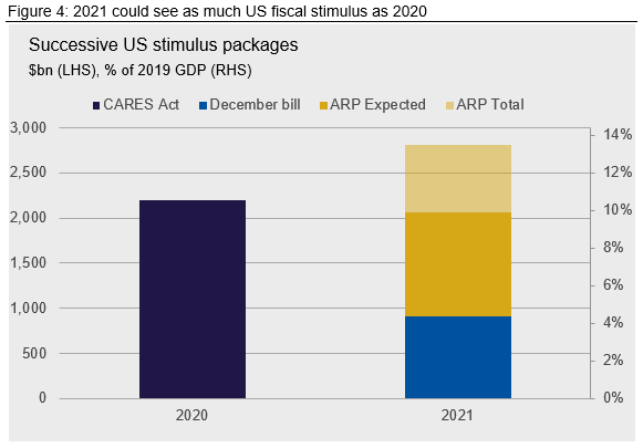 Fiscal stimulus packages have been much smaller outside the U.S. In China it was 6.1% of GDP in 2020; more is expected in 2021 as part of China’s 14th Five Year Plan. The EU undertook fiscal stimulus of around 4% of GDP in 2020, and the Next Generation Fund will deliver a further 4% over the period 2021-26. Even though fiscal packages outside the U.S. have been smaller, when several countries stimulate together it gives rise to a larger impact on global demand growth.