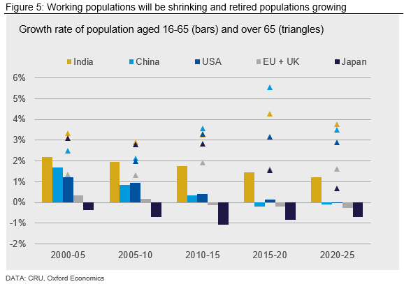 Longer term factors could also push up inflation. Economists Charles Goodhart and Manoj Pradhan have drawn attention to how important demographic change could be for the global economy. Apart from India, most major economies will see the working age population shrink over the next five years and beyond (Figure 5). Meanwhile, the number of people of retirement age will continue to grow at relatively fast rates.