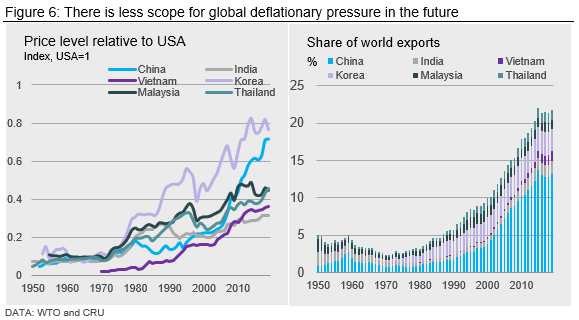 Figure 6 shows that by 2019 average prices in China had increased to 70% of U.S. prices—so no longer so cheap. Chinese exports to the rest of the world have also plateaued. This is evidence that the deflationary forces are waning. Sentiment against globalization has also hardened, epitomized by the U.S.-China trade war. Many now predict further de-globalization.