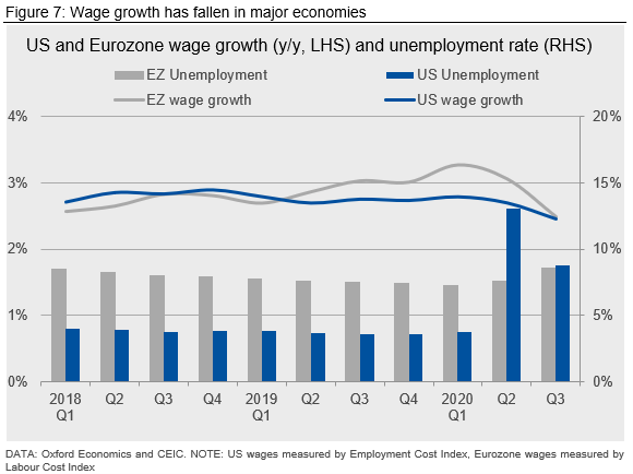 Wages make up the largest component of costs in the economy, and so a sustained rise in inflation will only come about with a sustained rise in wage growth. At the moment, there is little evidence that this is an area of concern. Wage growth has decelerated in both the U.S. and Eurozone (Figure 7). Unemployment remains elevated and would be even higher in Europe without extensive government support. Although a recovery in GDP will boost labor demand, it may take time for unemployment to return to 2019 levels. Furthermore, 2019 saw wage growth of 2-3% in the U.S. and Europe, broadly consistent with inflation targets. Higher rates of wage growth would probably be needed to push inflation persistently above target.