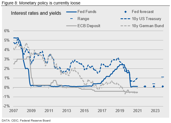 Whether the factors above translate into actual inflation depends on how central banks respond. Currently, monetary policy in advanced economies is exceptionally loose. However, this is in response to years of disappointing growth and modest inflation—and of course the pandemic. If the inflationary pressures outlined above appear likely to push inflation above central bank targets, the likely outcome will be tighter policy—or a quicker end to QE.
