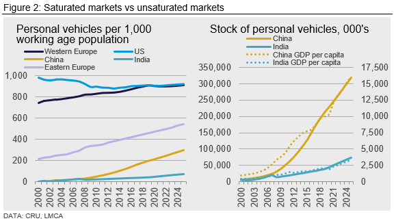 For unsaturated markets, the increase in the stock of personal vehicles on the road has closely followed GDP per capita. China’s outpacing of India in the stock of personal vehicles from 2007 onwards is matched by a similar faster pace of growth in GDP per capita.