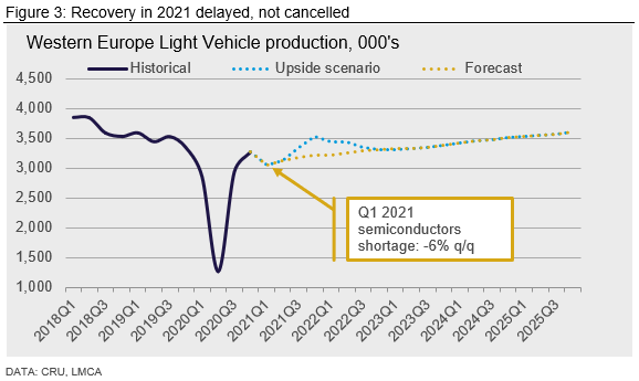 Western Europe—Bumpy 2020 but room to run in 2021: Light vehicle production in Western Europe dropped by ~26% in 2020, even more than during the GFC. However, output recovered strongly in late 2020, and we expect 2021 to record a strong annual growth rate, albeit not strong enough to return to 2019 output levels. While the short-term outlook is clouded by extended lockdowns and the semiconductor shortage, our view is that the WE auto recovery is delayed, not cancelled.