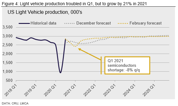 So far there are few signs that the semiconductor shortage is affecting metal demand. This may be because OEMs expect it to be temporary, and still want metal stocks to produce later in the year. For example, impact on aluminum demand has been limited because the shortage has had less of an impact on premium brands, which are the most aluminum intensive, such as EVs. However, if production faces longer-lasting disruption, it is likely this will feed through to demand for metal products.
