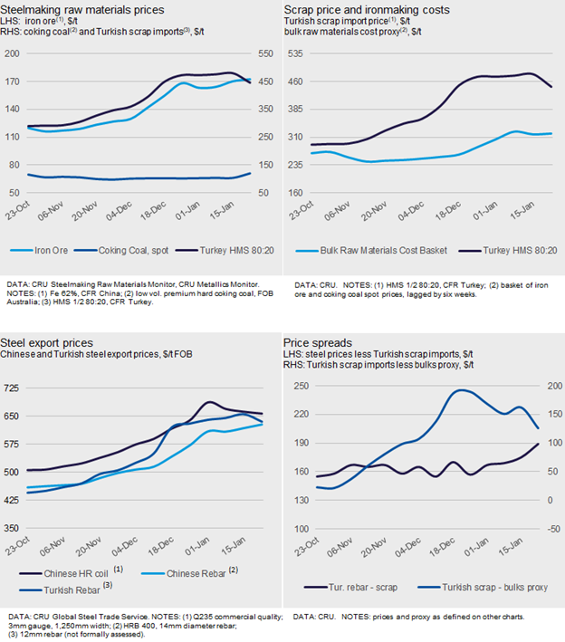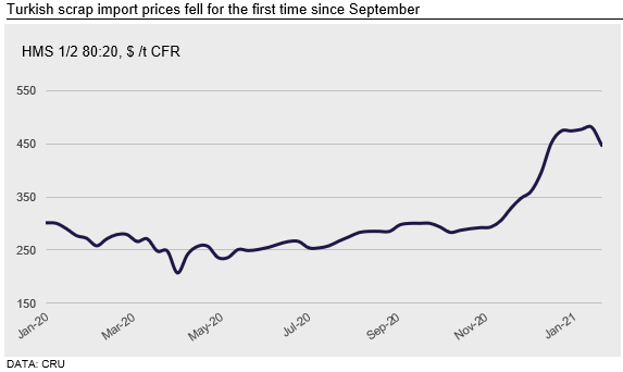 Last week, Turkish scrap import prices fell for the first time since September 2020. CRU recorded two deals and assessed HMS 1/2 80:20 at $446 /t CFR (- $34 /t w/w, -$27 /t m/m). The enlarged spread between HMS 1/2 80:20 and shredded scrap prices remained at $11 /t—a level that has remained the same since the week ended Jan. 8.