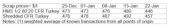 According to market contacts, one potential reason for this price drop is that steelmakers believe the scrap sellers have more supply availability. This can be partly attributed to a seasonally atypical increase in scrap collection and delivery in markets like the U.S. where winter has been generally mild. Also, mills have been keener to build scrap inventories given the rapid price increases w/w since September.
