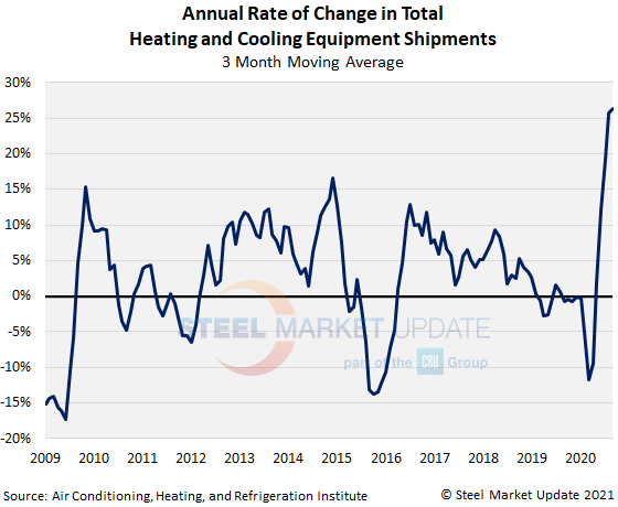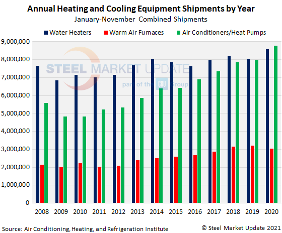 Below is a graph showing the history of total water heater, warm air furnace and air conditioner shipments. To use its interactive features, view the graph on our website by clicking here. For assistance with either logging in or navigating the website, contact Info@SteelMarketUpdate.com.