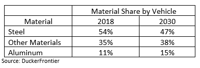 It should come as no surprise to any of our steel audience that aluminum sheet is the sector gaining share in automotive. In 2016, sheet represented 19% of aluminum’s total share or 77 pounds per vehicle. In 2020, it had climbed to 107 pounds or a 23% share. By 2030, forecasts place aluminum sheet at 30% or 171 pounds per vehicle. This shift has come at the expense of steel: