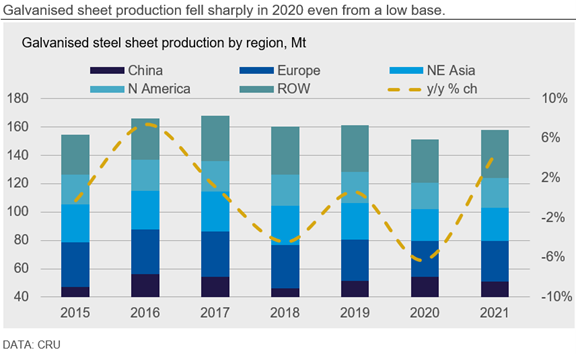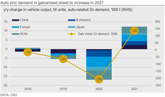 The implementation of COVID-19 lockdowns around the world had a dramatic impact on heavy industry throughout 2020 H1. The automotive sector was particularly hard hit by lockdowns and many lines were forced to halt operations. Galvanized sheet is used widely in vehicle doors, frames and panels, especially in higher-end models common in more developed and high-income regions. In North East Asia, CRU’s Economics team estimate that combined Japanese and South Korean automotive production declined 17.4% last year. In North America, where vehicles are often large and therefore use more galvanized steel, production declined by around 20.7%. The sharpest fall was in Europe, where automotive output fell a staggering 27.4%, down over 5.5 M units y/y, even from a cyclically weak base year. However, China’s auto sector outperformed the rest of world following a strong end to the year, with output contracting only a modest 2.6% in 2020. Overall, global vehicle output fell by an estimated 18.1% last year, a sharper decline than was experienced in 2009 during the GFC. This is equal to a loss of over 200,000 t of zinc demand, most of which is in galvanized sheet.