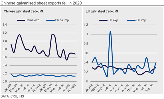 In China, net exports of galvanized sheet fell 14.0% year to date in November, highlighting the strength of the recovery and domestic demand. Total exports contracted 12.4% during this period, with a sharp fall in shipments to South Korea, Chile, Vietnam and Indonesia. In contrast, Chinese exports to the Philippines, Thailand and Brazil rose 10%, 19.8% and 35.4%, respectively. Chinese imports fell by 4.8% in the year to November, with volumes from Europe and Japan down sharply. In contrast, volumes from Taiwan and South Korea increased 11.5% and 1.7%, respectively.