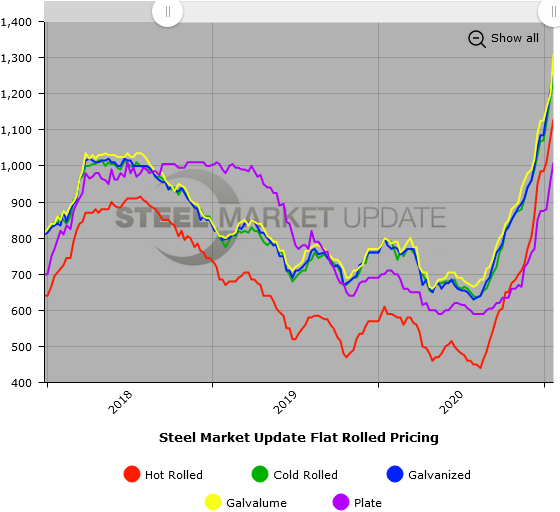 SMU Note: Below is a graphic showing our hot rolled, cold rolled, galvanized, Galvalume and plate price history. This data is available here on our website with our interactive pricing tool. If you need help navigating the website or need to know your login information, contact us at info@SteelMarketUpdate.com.