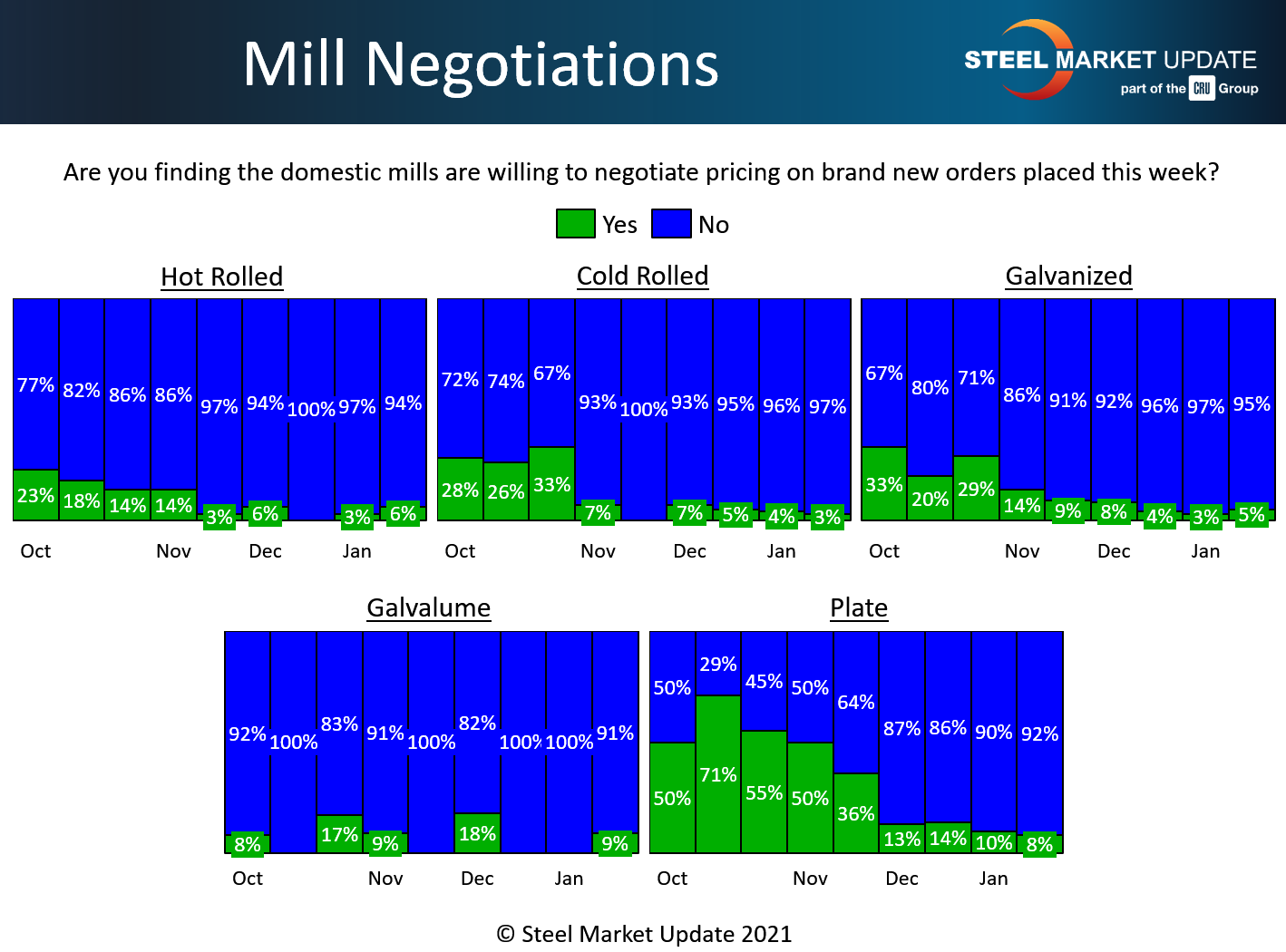 There has been little to no price negotiations between spot buyers and the mills since September, and Steel Market Update data shows no sign that is changing. More than nine out of 10 buyers responding to SMU’s questionnaire this week (note the predominant blue bars) reported that the mills are almost always unwilling to negotiate the price on any flat rolled or plate product.