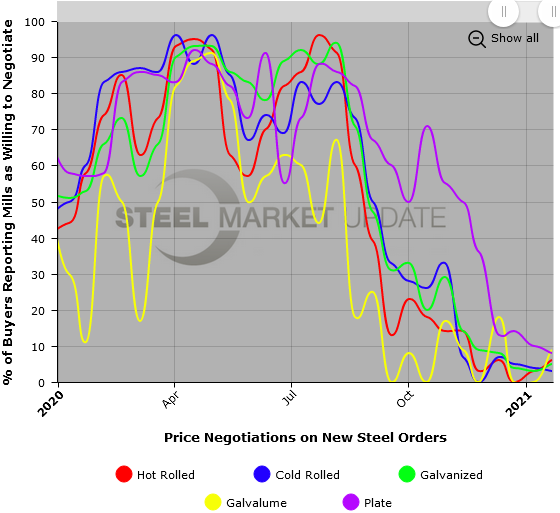 Note: These negotiations are based on the average from manufacturers and steel service centers who participated in this week’s SMU market trends analysis. To see an interactive history of our Negotiations data, visit our website here.