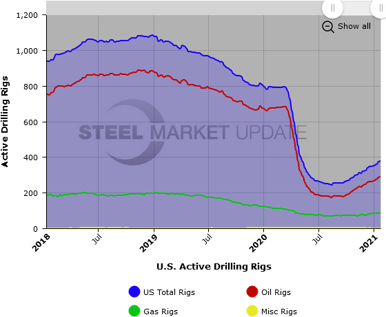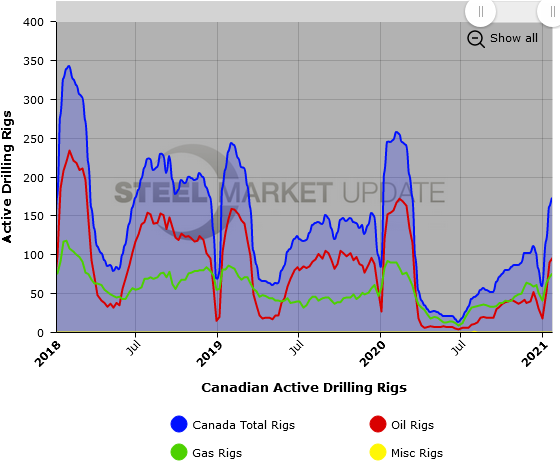 U.S and Canadian active rotary drill rig counts increased again this week, according to data released by oilfield services company Baker Hughes. The rig count is important to the steel industry because it is a leading indicator of oil country tubular goods demand.