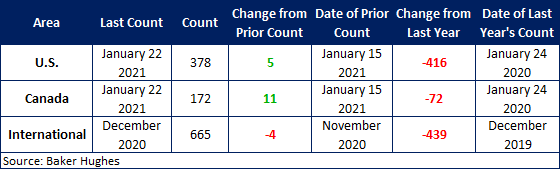 The number of active U.S. rigs rose by 5 to 378, with oil rigs up 2, gas rigs up 3, and miscellaneous rigs unchanged. Compared to this time last year, this week’s count is down 416 rigs, with oil rigs down 387, gas rigs down 27, and miscellaneous rigs down 2. See the first graph below for a history of active U.S. rig counts.