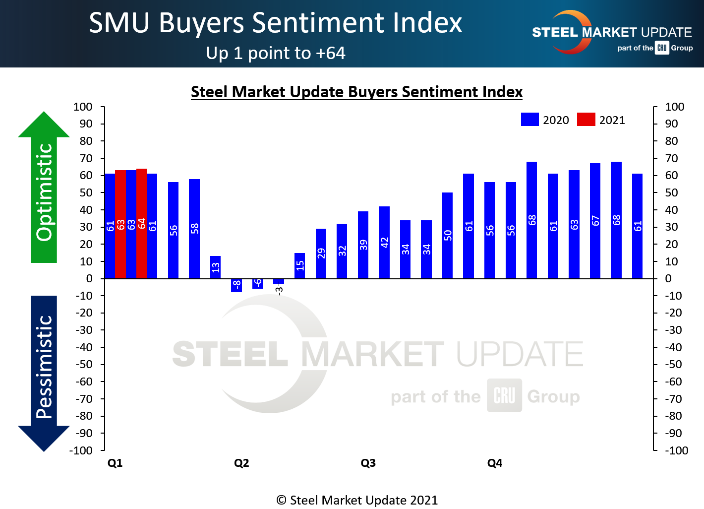 Every two weeks, SMU asks steel buyers how they view their company’s chances for success in the current environment. The Current Sentiment Index increased by one point this week to a very optimistic reading of +64—up 72 points from the pandemic-induced low of -8 back in April