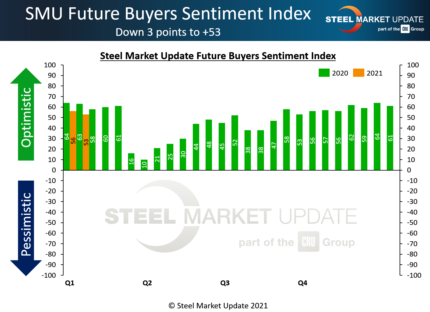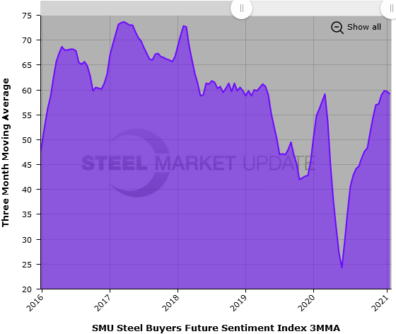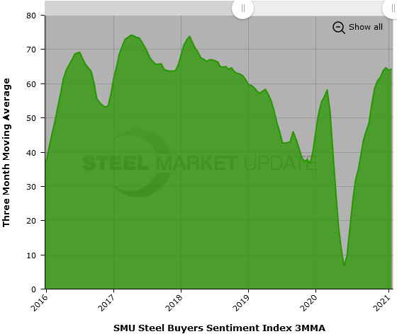 SMU also asks buyers how they feel about their chances for success three to six months in the future, which is more uncertain. SMU’s Future Sentiment Index moved down by three points to register +53 on concerns over steel prices and availability, the COVID pandemic and the change of administration in Washington. Future Sentiment readings have declined by 11 points over the past six weeks, from +64 on Dec. 10. Yet at +53, Future Sentiment remains above the average of +48 in 2020 and +51 in 2019.