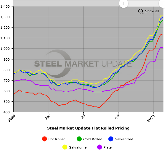 SMU Note: Below is a graphic showing our hot rolled, cold rolled, galvanized, Galvalume and plate price history. This data is available here on our website with our interactive pricing tool. If you need help navigating the website or need to know your login information, contact us at info@SteelMarketUpdate.com.