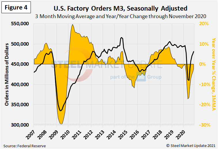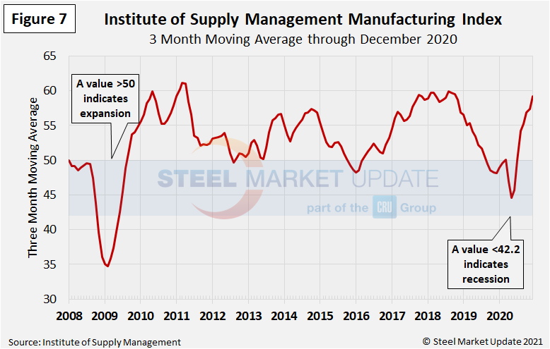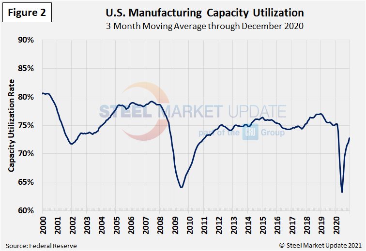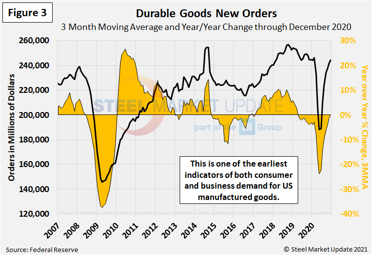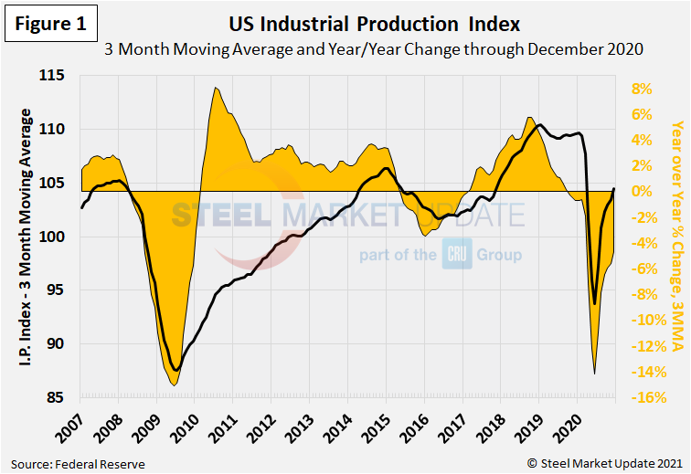 U.S. industrial production, manufacturing and durable goods orders through December continued to show improvement from the coronavirus pandemic downturn. The health of the manufacturing economy has a direct bearing on the health of the steel industry.