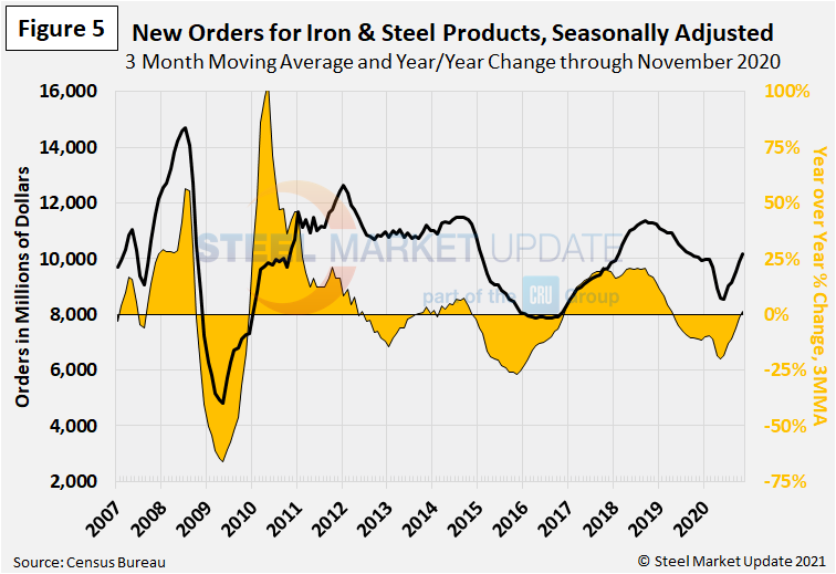 Within the Census Bureau M3 manufacturing survey is a subsection for iron and steel products. Figure 5 shows the history of new orders for iron and steel products since January 2000 as a 3MMA. The 3MMA year-over-year growth rate, which reached negative 20.0 percent last May, rebounded to positive 1.4 percent year-over-year last November at $10.2 billion.