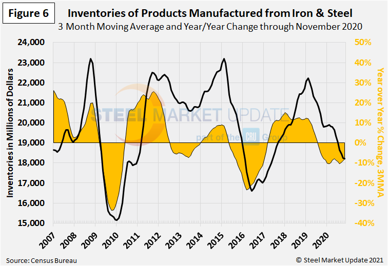 Inventories of iron and steel products continued to decline through the November data, down 8.1 percent to $18.2 billion on a 3MMA basis, compared to the same period the year prior (Figure 6). The fact that new orders for manufactured goods were up while inventories of manufactured goods were down may reflect the tight availability and rising price of steel late last year.
