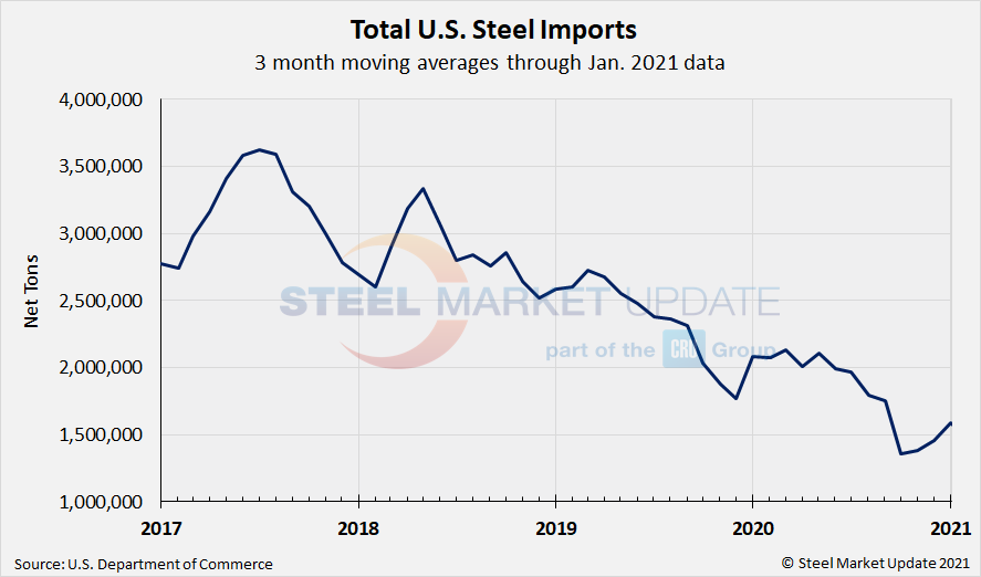 Due to large month-to-month swings in semifinished imports, the chart below shows total monthly imports on a three-month moving average (3MMA) basis in an attempt to more accurately display the U.S. steel import trend. The 3MMA for December is now 1.46 million tons, up from 1.38 million tons in November. The average monthly import level for 2020 is now 1.83 million tons through December preliminary Census data, down compared to the 2019 average of 2.32 million tons.