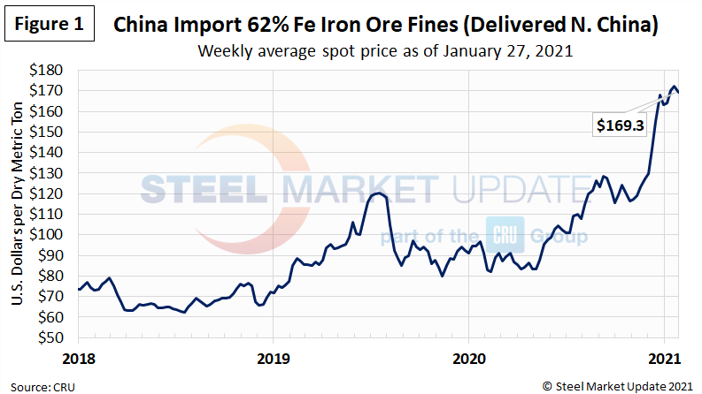 The Chinese import price of 62% Fe content iron ore fines has been on the rise since May. Figure 1 shows the price of 62% Fe delivered North China since January 2018 at $169.3 as of Jan. 27, up 86 percent over levels one year ago. (Editor’s note: Subsequent to this writing, our sister company CRU reported a sharp decline in iron ore prices in China, which took the 62% Fe fines price down to $152.0 /dmt, a $15.5 /dmt decline w/w as of Feb. 2).