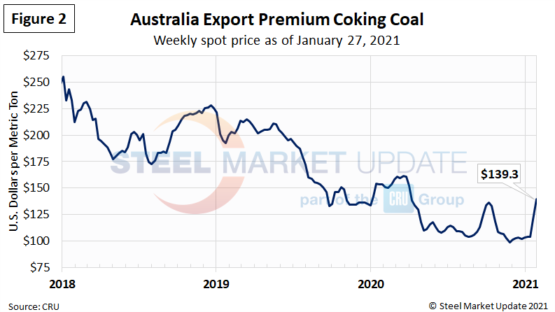 The price of premium low volatile coking coal FOB east coast of Australia had jumped up in September/October, then declined to a low of $98.5 in late-November. Prices have bounced upwards since then, currently at $139.3 dollars per dry metric ton as of Jan. 27 (Figure 2). The seaborne coking coal price has not been able to fully benefit from the strong demand in China due to import restrictions. Recent coking coal prices remain at the lowest levels seen in SMU’s limited history.