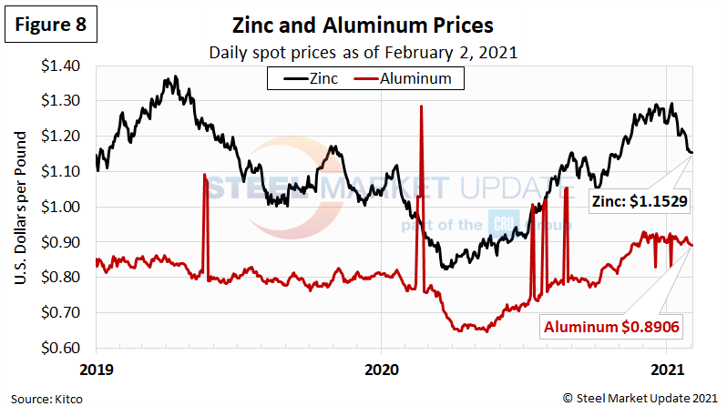 Zinc, used to make galvanized and other products, had steadily risen since March 2020, reaching an 18-month high on Jan. 7 (Figure 8). The LME cash price per pound of zinc as of Feb. 3 was $1.1529, up 40 percent from the mid-March low of $0.8236. The price of zinc factors into the coating extras charged by the mills for galvanized products. Many mills revised their coating extras upwards in December to reflect the higher zinc price. Aluminum prices, which factor into the price of Galvalume, have been trending upwards over the last few months. Note that aluminum prices often have large swings and return to typical levels within a few days, as seen in the graphic below. The LME cash price per pound of aluminum was $0.8906 as of Feb. 2, and has been hovering around $0.90 since late-November 2020.