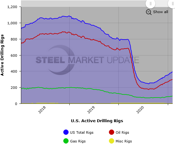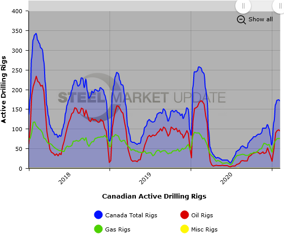 U.S active rotary drill rig counts increased again last week, while Canadian rig counts declined, according to data released by oilfield services company Baker Hughes. The rig count is important to the steel industry because it is a leading indicator of oil country tubular goods demand.