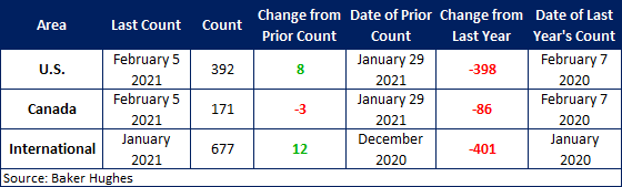The number of active U.S. rigs rose by 8 to 392, with oil rigs up 4, gas rigs up 4, and miscellaneous rigs unchanged. Compared to this time last year, this week’s count is down 398 rigs, with oil rigs down 377, gas rigs down 19, and miscellaneous rigs down 2. See the first graph below for a history of active U.S. rig counts.