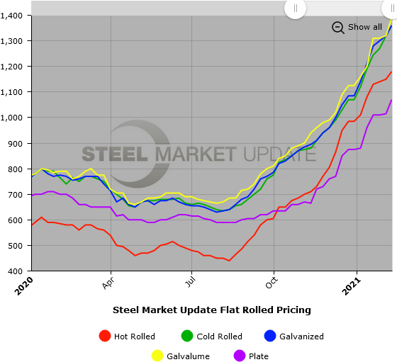 SMU Note: Below is a graphic showing our hot rolled, cold rolled, galvanized, Galvalume and plate price history. This data is available here on our website with our interactive pricing tool. If you need help navigating the website or need to know your login information, contact us at info@SteelMarketUpdate.com.