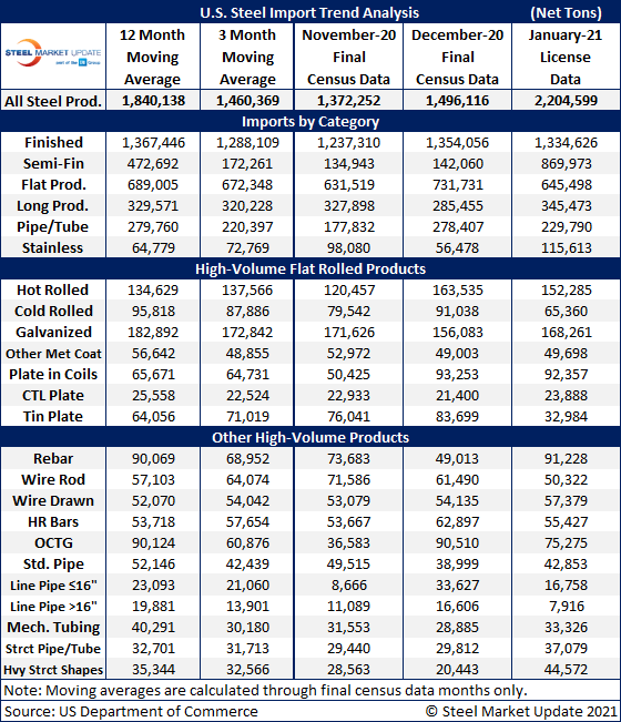 Due to large month-to-month swings in semifinished imports, the chart below shows total monthly imports on a three-month moving average (3MMA) basis in an attempt to more accurately display the U.S. steel import trend. The 3MMA through final-December data is now 1.46 million tons, up from 1.38 million tons in November.