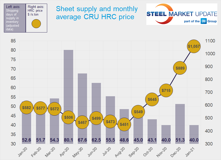 End-of-January service center flat rolled steel inventories fell back to levels seen in November 2020. At the end of January, service centers carried 40 shipping days of supply – tied with November for the lowest inventory level in the last two years. January supply was down from 51.3 shipping days in December; the 22 percent drop in supply month on month was more than the 16 percent seen in the year-ago period. In January 2020, service centers carried 52.6 shipping days of supply.