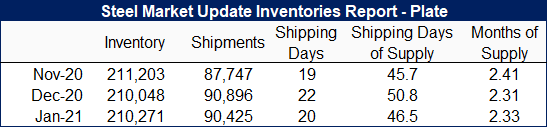 Plate inventories also fell back to levels similar to what was seen in November. Service centers carried 46.5 shipping days of supply at the end of January, down from 50.8 days in December. Though inventories declined month on month, they did not fall as much as the year-ago period, as shipments in January 2021 were lower. In the December 2020-January 2021 period, the number of shipping days of supply fell 8 percent. In the December 2019-January 2020 period, supply fell 20 percent to 48.4 shipping days.