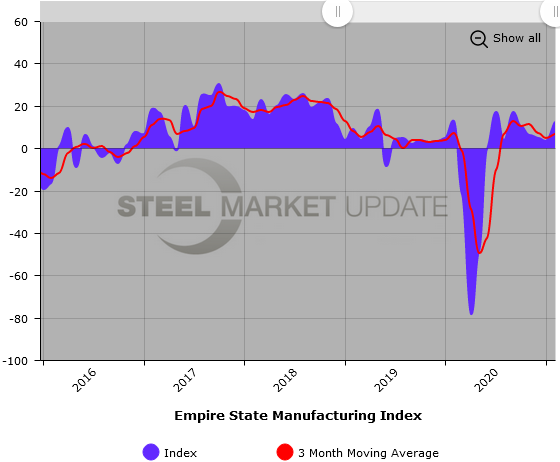 Below is a graph showing the history of the Empire State Manufacturing Index. You will need to view the graph on our website to use its interactive features; you can do so by clicking here. If you need assistance logging into or navigating the website, please contact us at info@SteelMarketUpdate.com.
