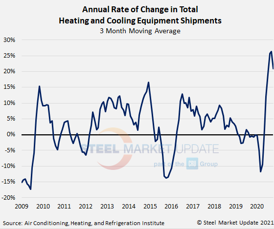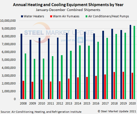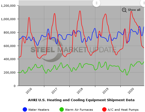 Below is a graph showing the history of total water heater, warm air furnace and air conditioner shipments. To use its interactive features, view the graph on our website by clicking here. For assistance with either logging in or navigating the website, contact Info@SteelMarketUpdate.com.