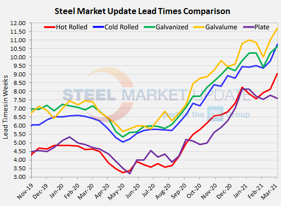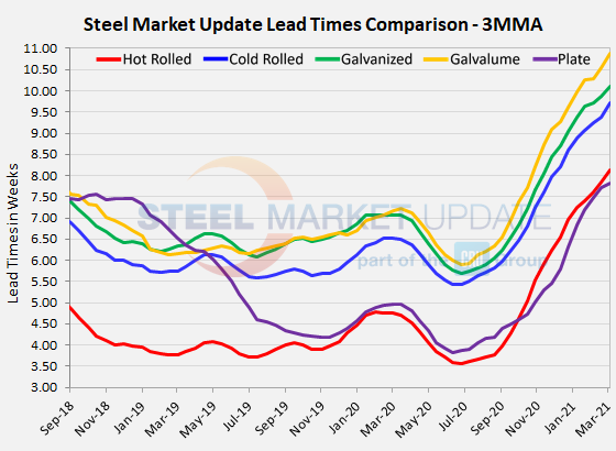 Viewed as three-month moving averages to smooth out the volatility, hot rolled lead times have continued to extend to 8.13 weeks, cold rolled to 9.71 weeks, galvanized to 10.10 weeks, Galvalume to 10.89 weeks and plate to 7.82 weeks.