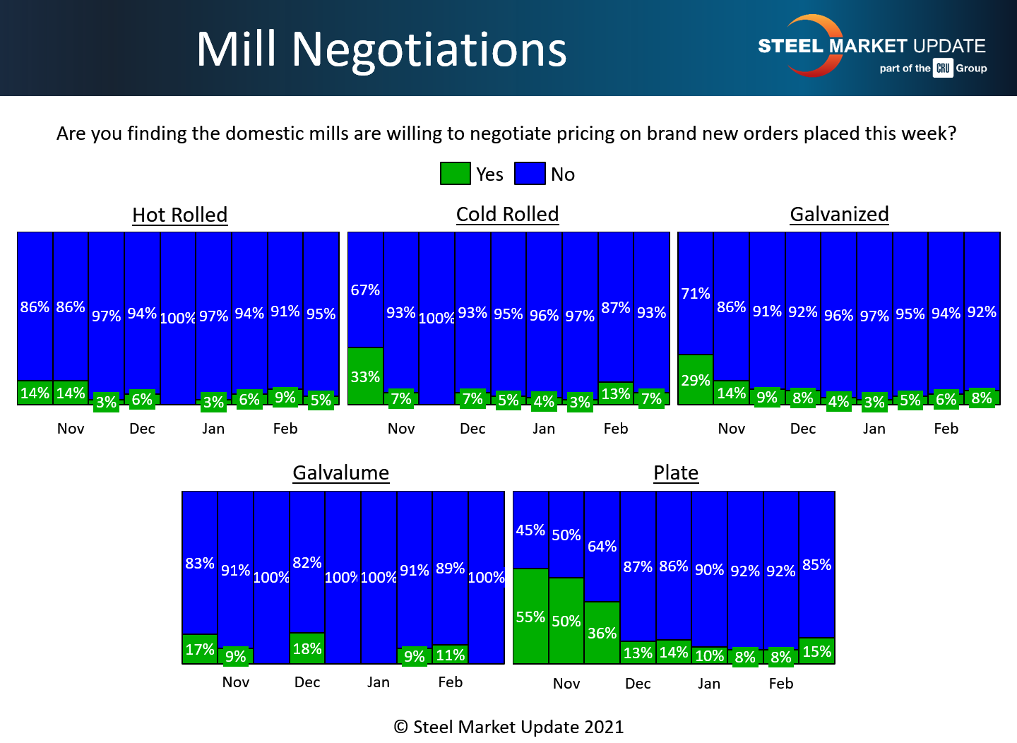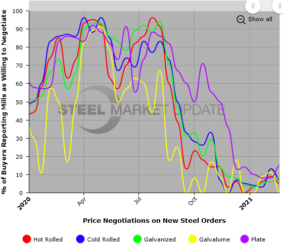 Steel Market Update data shows no significant change in the negotiating position of steel buyers, who remain largely at the mercy of the mills. More than nine out of 10 buyers responding to SMU’s questionnaire this week reported the mills unwilling to discuss price concessions—which has been the mills’ attitude for the past five months.