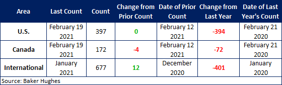 The number of active U.S. rigs remained steady at 397, with oil rigs down 1, gas rigs up 1, and miscellaneous rigs unchanged. Compared to this time last year, this week’s count is down 394 rigs, with oil rigs down 374, gas rigs down 19, and miscellaneous rigs down 1. See the first graph below for a history of active U.S. rig counts.