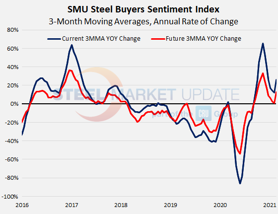 Steel Buyers Sentiment, as measured by Steel Market Update, hit a very optimistic +70 this week, not far from the highest reading ever recorded at +78 in January 2018. Future Sentiment was nearly as bullish at +63, just 14 points below its historical peak of +77, also in early 2018. Both Current Sentiment and Future Sentiment have made remarkable recoveries from near-record lows last April when the pandemic hit.